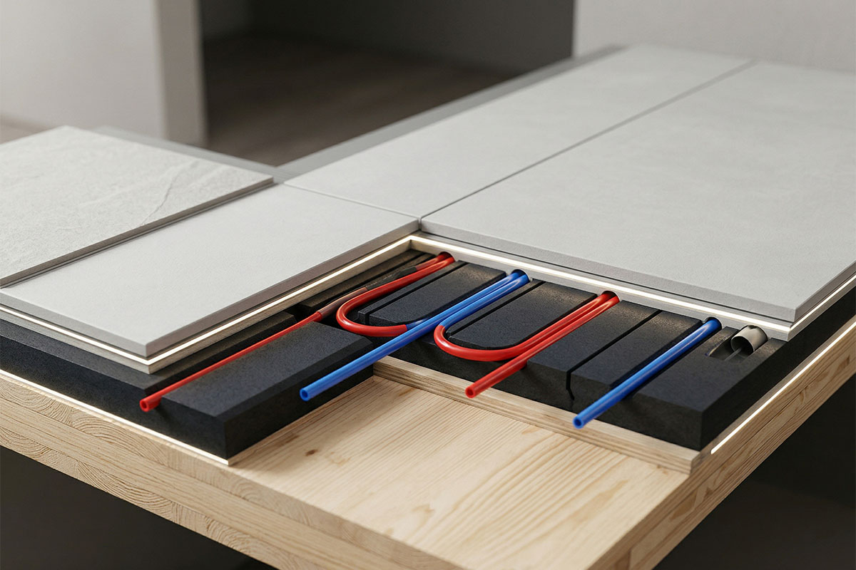 Il vero segreto di un pavimento a secco performante risiede nell’integrazione con gli impianti e le finiture. I pannelli prefabbricati ospitano le tubazioni del riscaldamento radiante e sono pronti per ricevere qualsiasi tipo di finitura (parquet, ceramica minimal, cemento architettonico) con collanti specifici o sistemi di posa flottante.