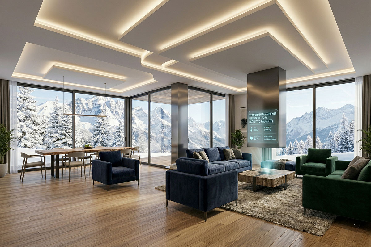 Abbinato a una VMC (Ventilazione Meccanica Controllata) con deumidificazione integrata, il soffitto radiante garantisce un’aria sempre pura e livelli di umidità perfetti, requisiti fondamentali per le certificazioni NZEB più rigorose.
